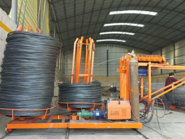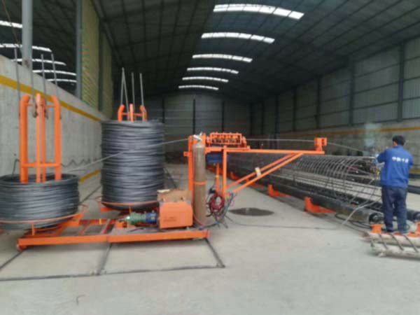 2、鋼筋籠12米以上,或者單節鋼筋籠較重時,骨架中間加焊1、2圈纏繞筋替代第三個過渡箍?;蛑苯又虚g開始繞筋,另半截籠前面向中間纏繞連接完成。所以三個過渡箍的中間一個箍應置放在中間靠后面的地方,借以減少沖擊振動。退出輥輪并過渡到后面輥輪的方法--將過渡箍向后面推壓,讓過渡箍順膠輥旋轉到上面直到全部退出。準備臺架;若采用骨架直接滾進輥輪內檔(小型鋼筋籠),骨架制作臺架高度與設備同高。